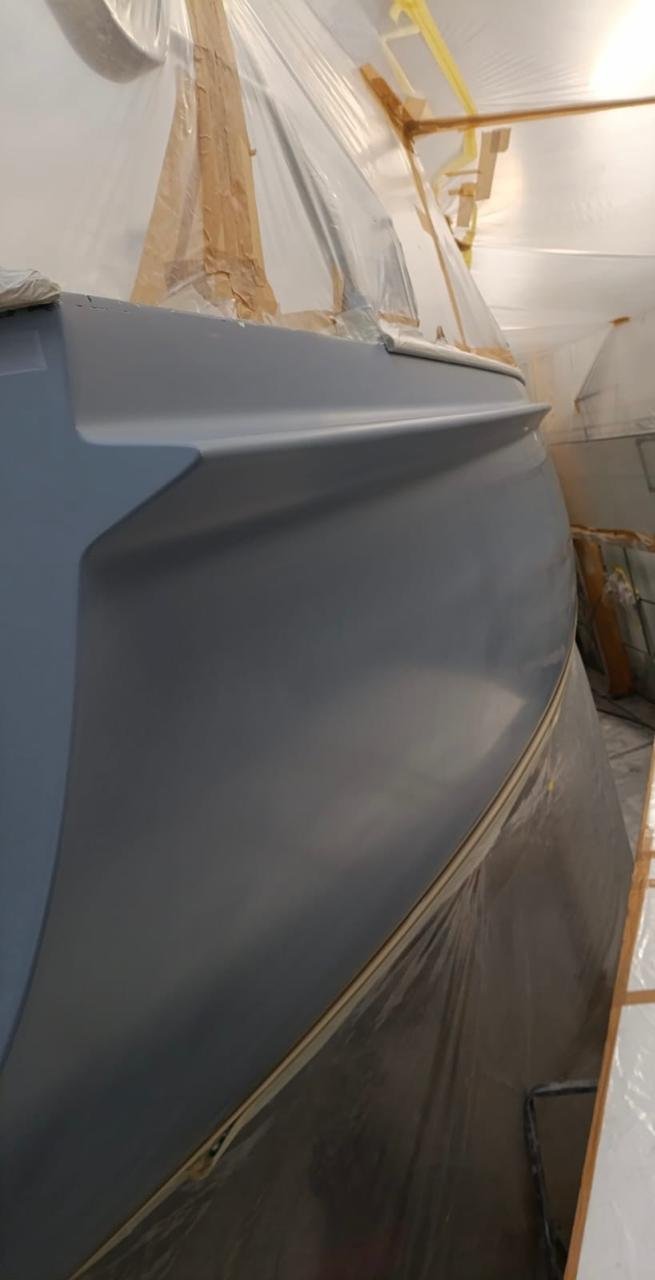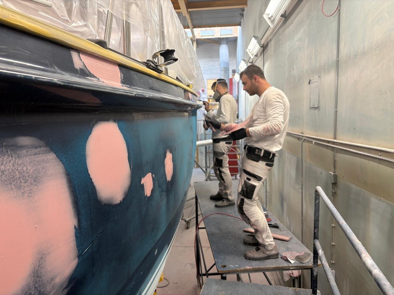 Repairing local damage on the yacht’s hull and applying a high-gloss topcoat in Majestic Blue.