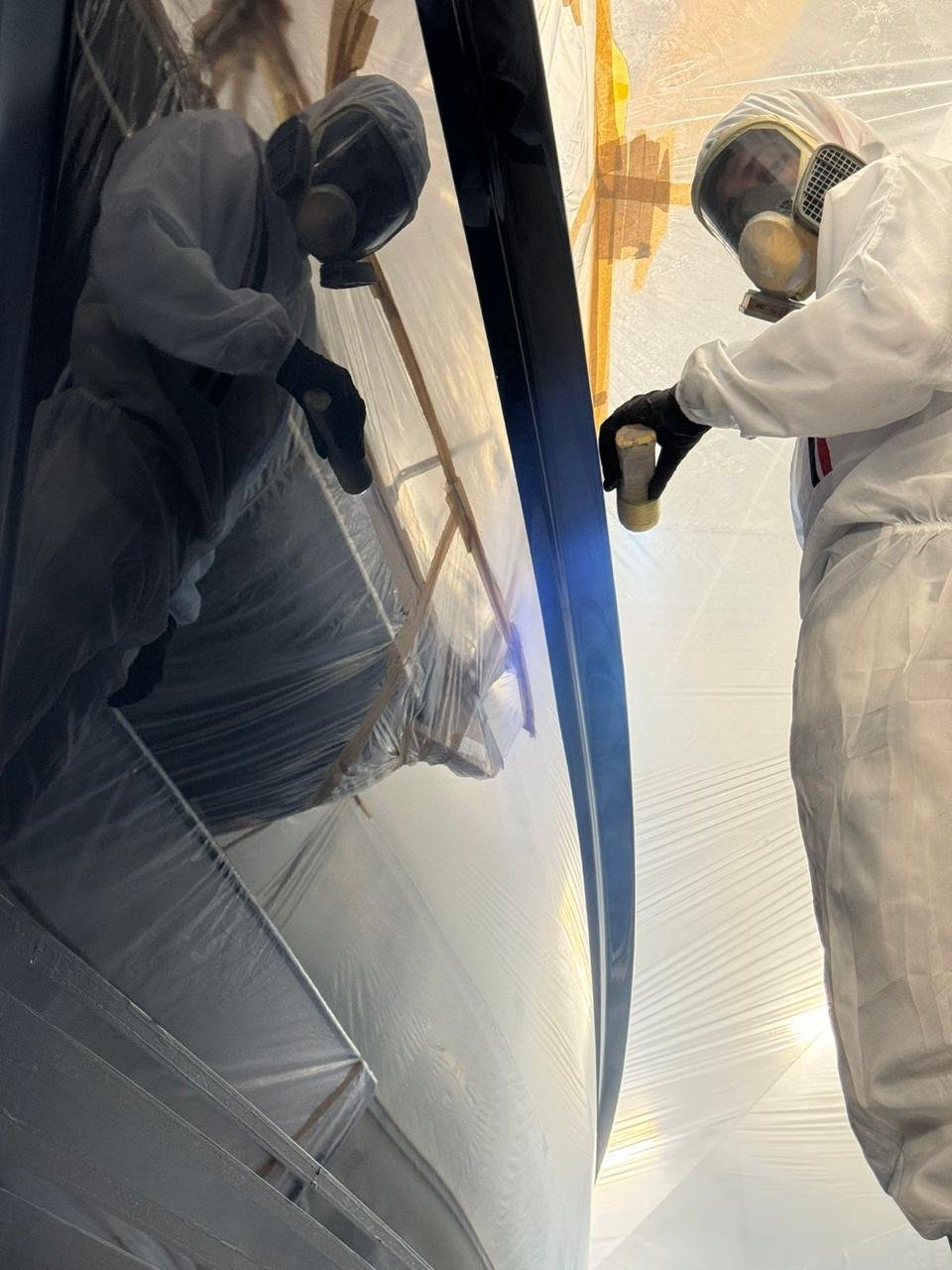 The entire procedure was carried out in a sealed spray booth to ensure a flawless finish, protect from contaminants, and enhance paint durability and brilliance.